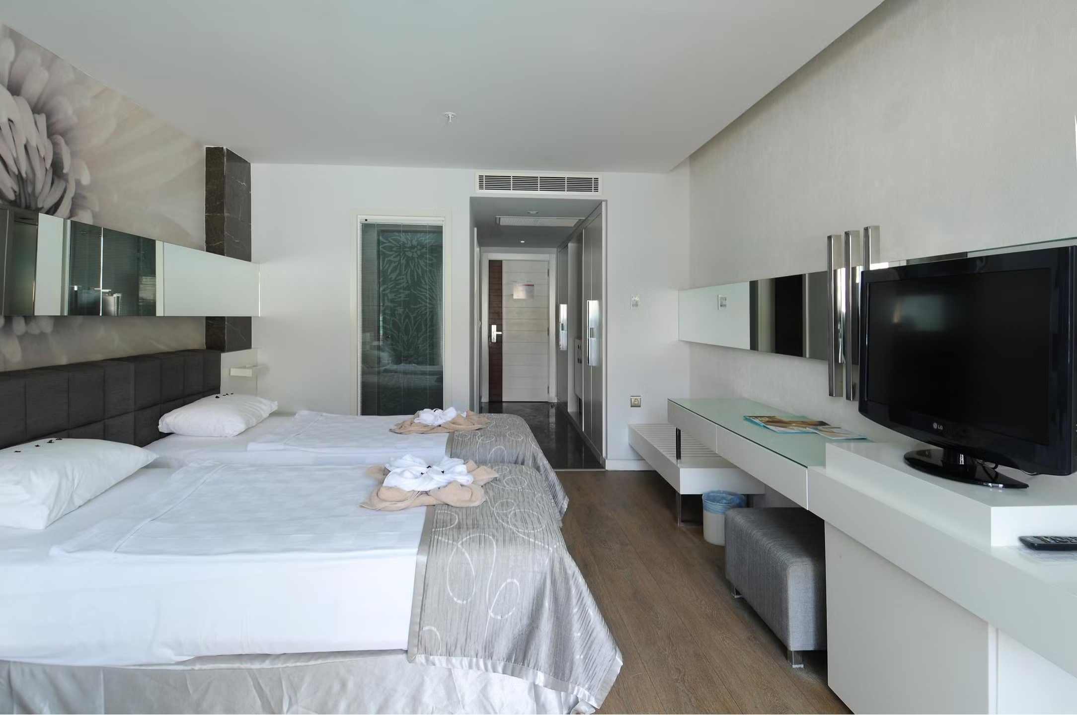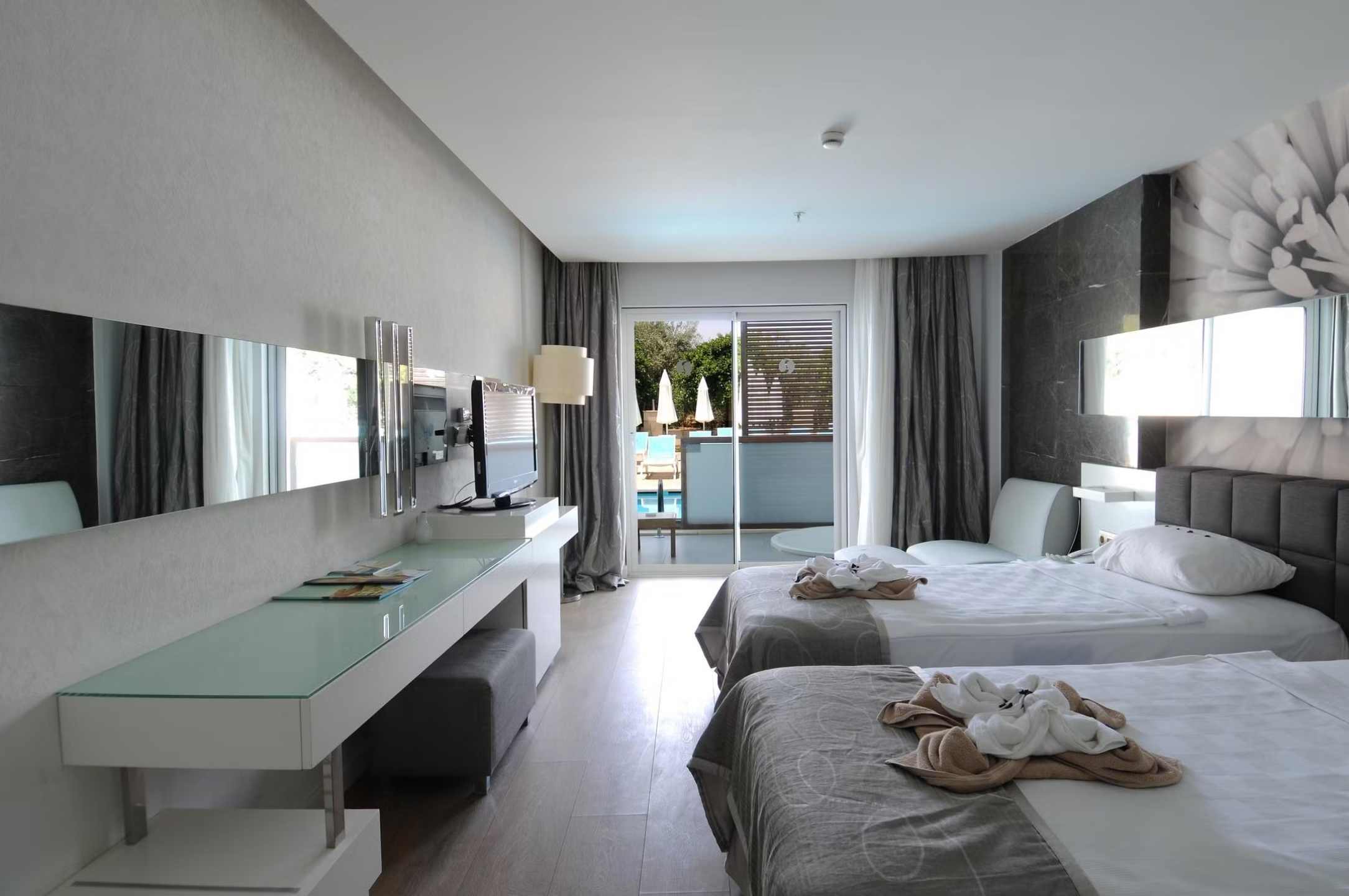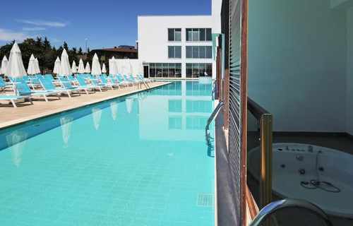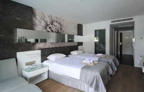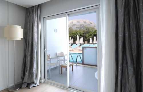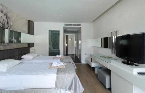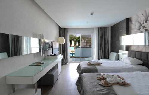 Swim Up Rooms (+16) feature either one double bed or twin beds. There is a Jacuzzi on the balcony, and the rooms have direct access to the shared pool. Air conditioning, shower, WC, TV, satellite broadcasting, telephone, air conditioning, safe, hot beverage set, hair dryer, balcony, laminate parquet flooring, mini cabinet (water-soda). Room cleaning is carried out daily, and bed linen and towels are changed 3 times a week. *Pets are not allowed. The maximum occupancy of our rooms is 2 adults. Guests of Lonicera WEST HOTEL may use all areas of Lonicera Resort Spa Hotel and Lonicera World Hotel, except the Main Restaurant, free of charge.