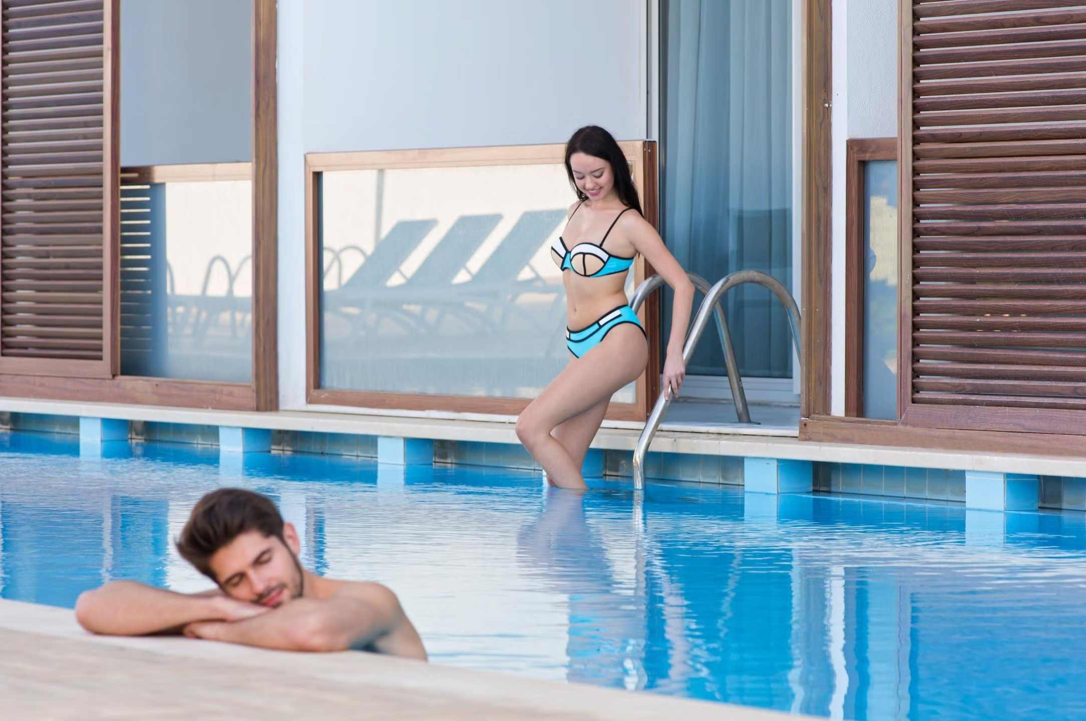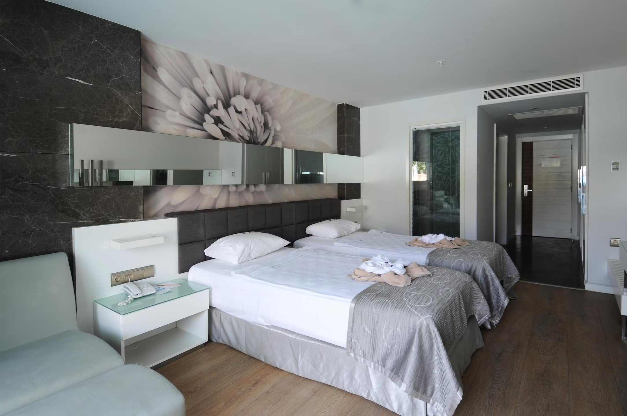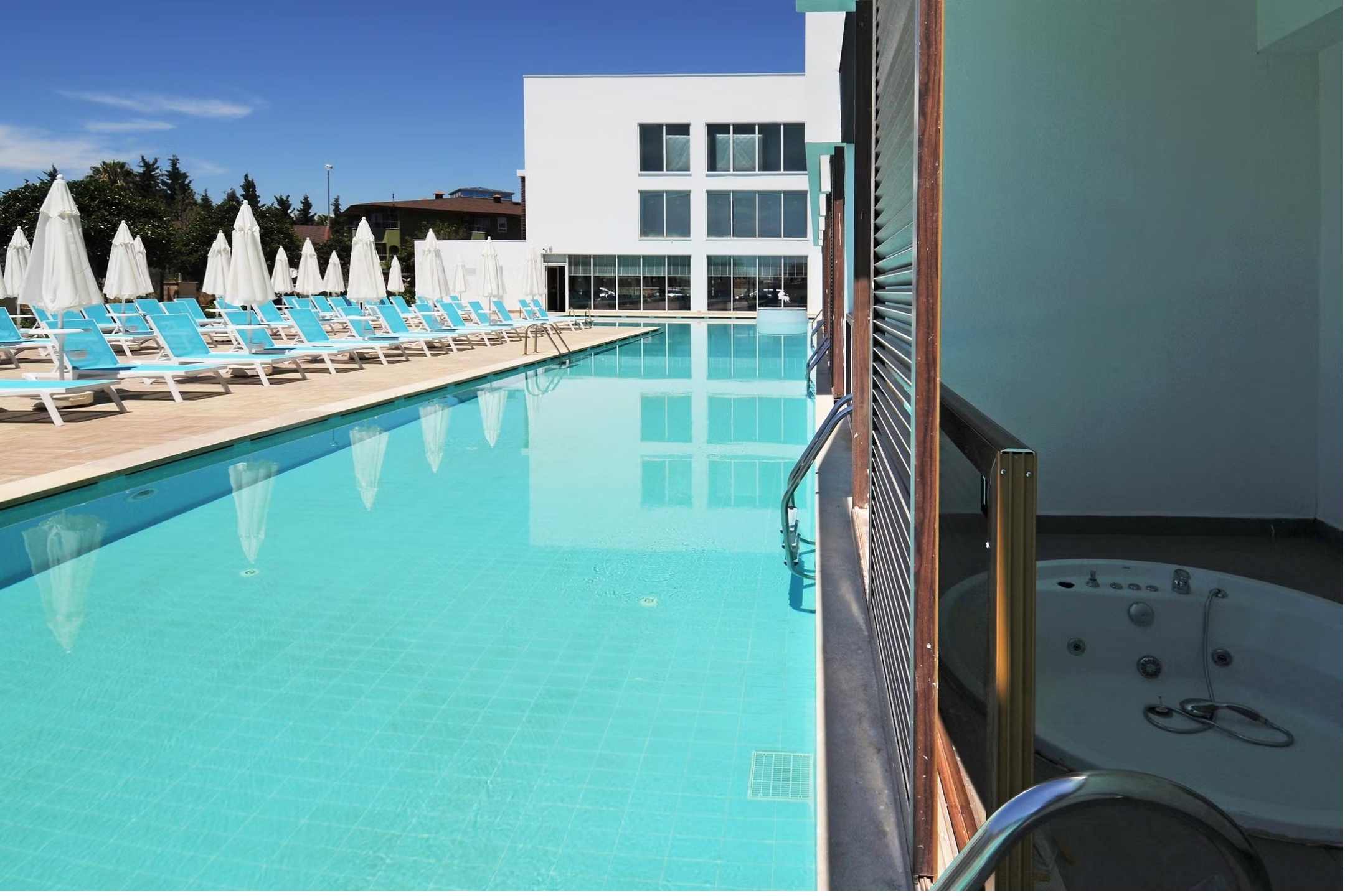 Swim Up Rooms (+16) feature either one double bed or twin beds. There is a Jacuzzi on the balcony, and the rooms have direct access to the shared pool. Air conditioning, shower, WC, TV, satellite broadcasting, telephone, air conditioning, safe, hot beverage set, hair dryer, balcony, laminate parquet flooring, mini cabinet (water-soda). Room cleaning is carried out daily, and bed linen and towels are changed 3 times a week. *Pets are not allowed. The maximum occupancy of our rooms is 2 adults. Guests of Lonicera WEST HOTEL may use all areas of Lonicera Resort Spa Hotel and Lonicera World Hotel, except the Main Restaurant, free of charge.